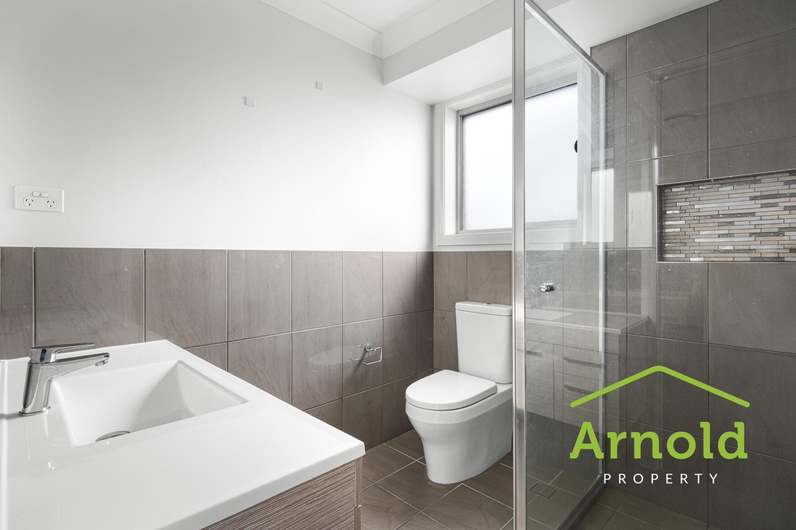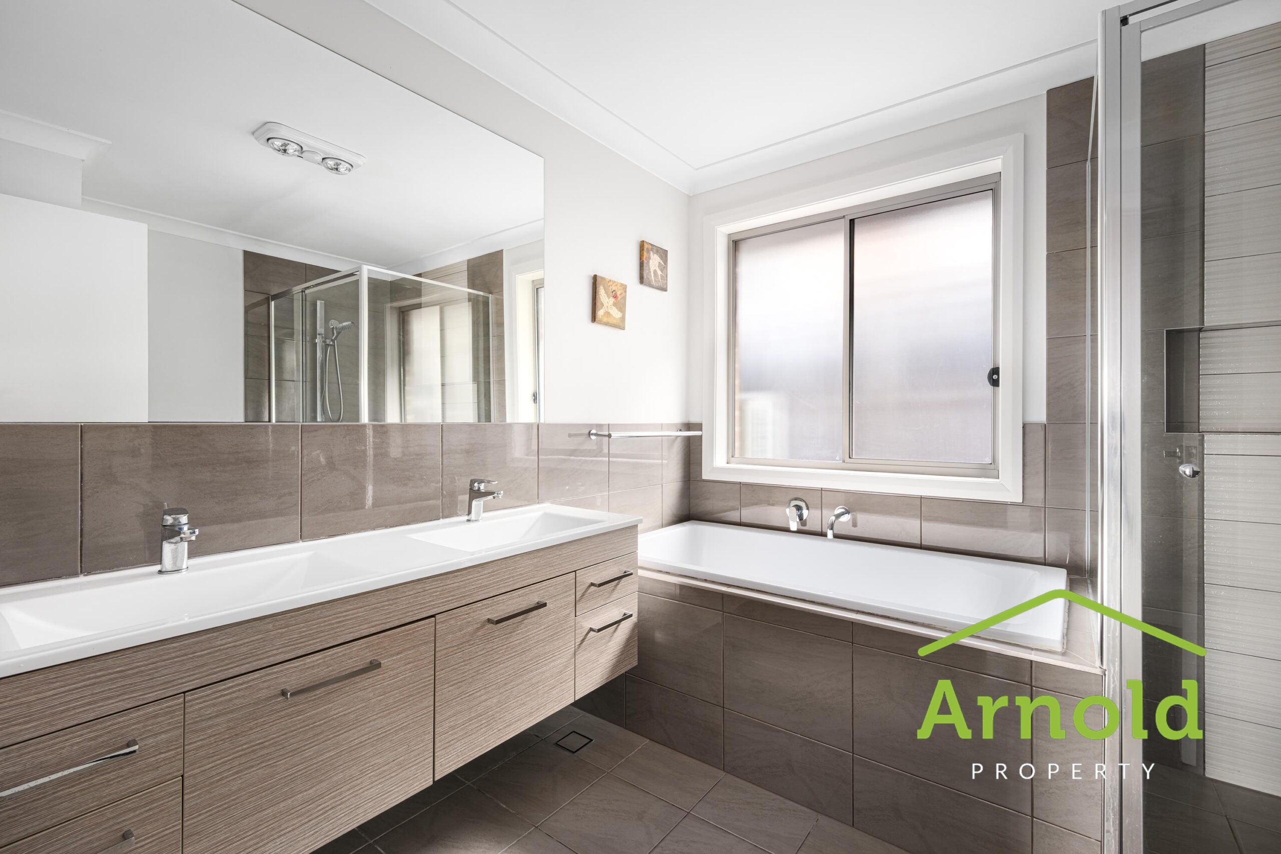 • Modern bathroom with a separate shower over bath.